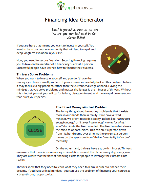 If this is the case, your task at hand is to find the money. Check out our Finance Idea Generator. Print it. Read it and you will start generating solutions-oriented thinking. This type of thinking is required for you to invest in what you want as a grounded, integrated experience. This is as important to me as it is to you. The reason? If you can make this investment and not sabotage your decision, you’ll be easier to coach to the results you want.