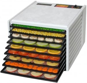 I prefer the Excalibur 9-tray dehydrator. The big selling point it that it has a fan and a thermometer. Get some Paraflex Sheets to make raw crackers, breads and fruit roll-ups.