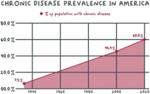 Chronic is a modern phenomenon. In 1935, 7.5% of American adults were chronic. Today we’re at 60% with a solid trajectory towards more suffering.9 Over 85% of health care costs go to treat chronic diseases.4