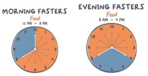 Morning fasters eat between noon and 8 pm on a normal day. Evening fasters eat between 8 am and 4 pm. Many people find it’s better for digestion to eat midday than later in the evening.