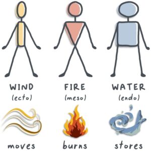 WIND types are fast, fun, and, as the wind, like to fly. The symbol of the ectomorph catabolic type is the elongated rectangle. People with this constitution usually have thin, lithe muscles, are naturally lighter for their size, and often have fluctuating digestion. They often unintentionally skip meals and prefer spontaneity over regularity.