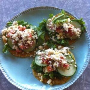 The corn is sweet and cooling, cleansing Rasa Dhatu. The salsa if it’s hot will also burn kapha out of Rasa Dhatu and balance the agni from the cooling corn. The raw cheese is unadulterated protein, especially when the cow is loved. Fresh raw cheeses nourish vata through their unctuous quality, necessary at the end of summer, also antidoting (new word) the dryness of the corn tortillas. Raw cheese, avocado and caeser dressing reduce vata, Cilantro and cucumber reduce pitta, corn and salsa reduce kapha. If you want to be an Ayurveda Geek take the ALC!!!